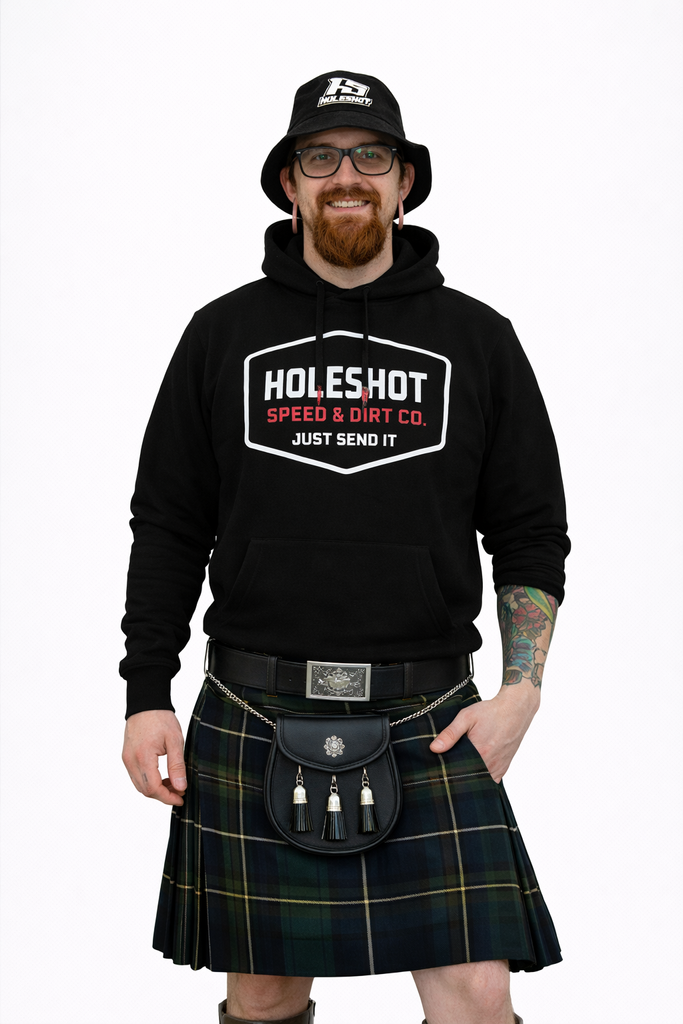 Upplev stil och komfort med Holeshot speed Hoodie. Denna svarta hoodie är designad för att möta kraven från både entusiaster och proffs. Med ett iögonfallande tryck i vitt och gult visar den upp texten 'Holeshot Just Send It Full Send Division'. Tillverkad av högkvalitativt material, erbjuder den både värme och hållbarhet.
