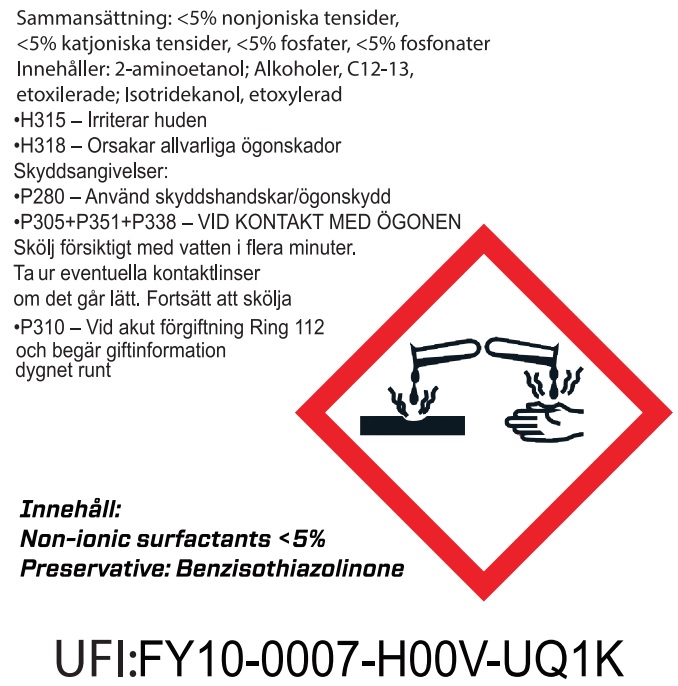 Formulan är alkalisk (pH ca 11) men fri från hydroxider, vilket gör den säker på plast, metall, gummi, lack och krom. Bara spraya, vänta och spola – ren kraft, inga kompromisser.